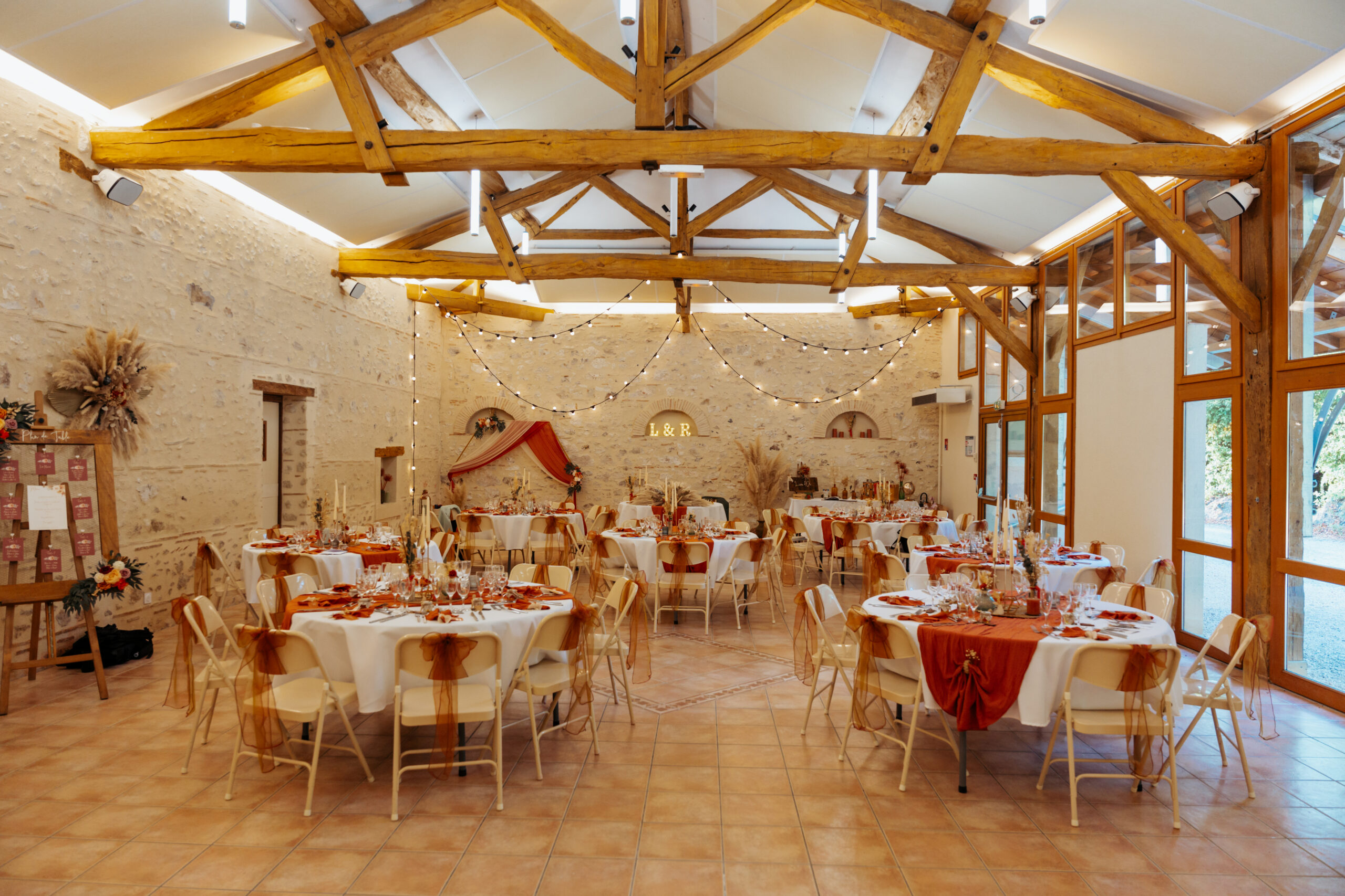 A l’écart du reste du domaine et du Château, entourée de calme, la salle de réception des Tilleuls, avec ses 150m², vous offre une ambiance champêtre au charme typique qui émane des charpentes anciennes et des murs en pierre apparentes.